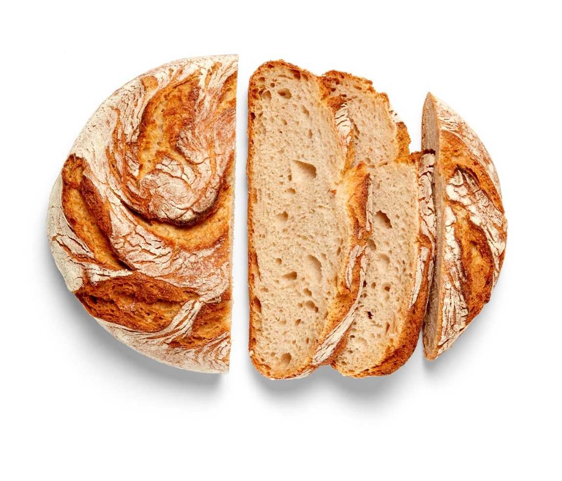 Oval with tips and a rustic appearance, lightly floured and scored three times.The crust is dark and very crunchy from baking on the stone oven floor.Its lively, robust grigne hints at the honeycomb crumb created by the sourdough, while the flavours of malt and rye are lasting and noticeable.