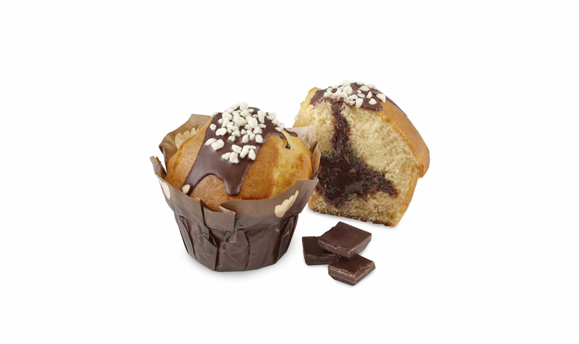 Muffin dough filled with milk chocolate, decorated with a topping of dark chocolate and white chocolate sprinkles. Our range of Premium muffins, now in a larger size.